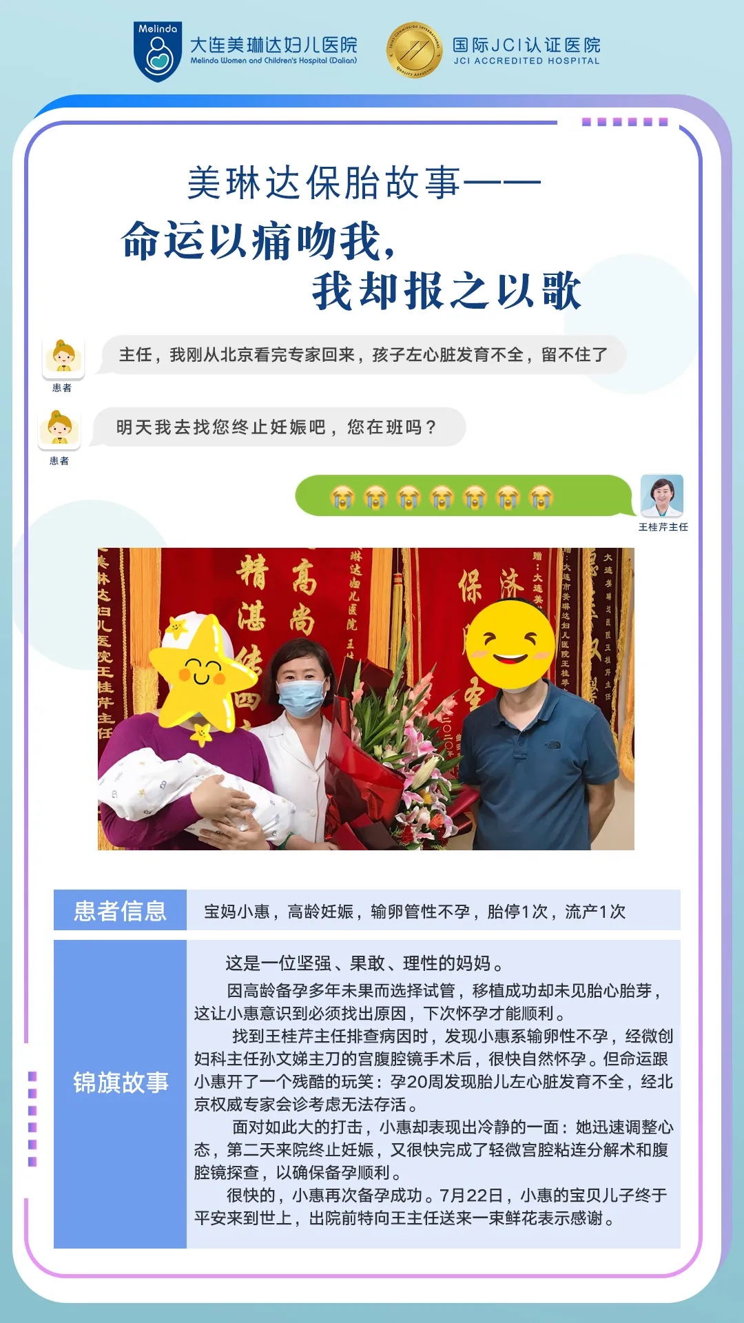 在2020年内,美琳达保胎中心已经帮助300多个家庭抱娃成功,许许多多悲喜交加的小故事汇成了美琳达保胎中心的故事。有曾经在孕20周查出胎儿心脏不全忍痛放弃的患者,有曾在孕29周重度子痫发作被迫终止妊娠的孕妈,有经历过4次胎停、2次试管移植失败的“失独”妈妈……幸运的是,她们的孕育故事终于在美琳达保胎中心迎来了美好结局。